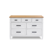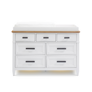 Spacious and stylish, the Artisan Double Dresser brings both form and function to your nursery. With seven generously sized drawers, it features soft-close glides, felt-lined top drawers, and cedar-lined bottoms to keep baby essentials neatly organized. Cedar drawer bottoms help acts as a natural dehumidifier. Add the Artisan Changer Tray (sold separately) to create a secure changing station during the infant stage.