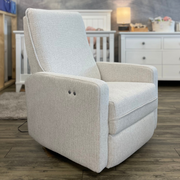 The Calli Swivel Glider Recliner is sleek, modern and perfectly sized to give a nursery, or any room, an instant update. Stylish details extend from the knife edge welt on back and seat to the power buttons that allow you to recline to any position at the simplist push. Deluxe your comfort and get extra support for your head and neck with the Power Tilt Headrest option that includes a USB port to conveniently charge your devices. Â Simplify your look by opting for the discreet inside recline handle. The smooth swivel glider action is soothing for the ultimate in relaxation. Choose from over a hundred fabrics to make it your own.