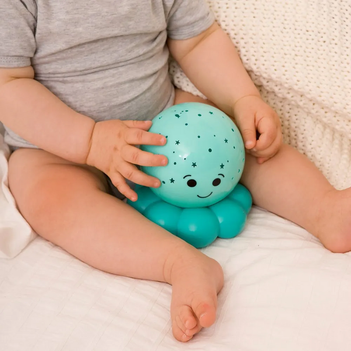 Twinkles To Go Octo™ was made for traveling, transforming any dark, scary new place into an underwater dreamland and making your little bug feel all snug and sleepy. Our bubbly octopus night light is bound to be an absolute must-have for traveling families - whether in the backseat, or the hotel suite! Twinkles glows soft bubbling fish and stars night after night. Twinkles features LED lights that keep the Octo's body cool, safe and long-lasting. And, with no cords to tangle with, Twinkles is always ready to travel. This incredibly lightweight, traveling nightlight has one on/off button. Press the button twice to change color setting. After 45 soothing minutes of stars and fish, an auto shut-off feature turns Octo off. Sleep is just a little bit sweeter with this glowing octopus who encourages quality, restful sleep. Bring all the comforts of home on the road with Twinkles To Go Octo™!