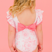 Bubblegum Pink Butterfly Garden Toile Butterfly One Piece is a delightful choice for your little girl's summer adventures. This pink butterfly one-piece swimsuit showcases a charming toile pattern featuring a serene butterfly garden theme, perfect for sunny days at the beach or poolside gatherings. Crafted with a blend of nylon and spandex, it offers a comfort fit while ensuring durability through countless swims. The stylish design, combined with the bubblegum pink hue, makes it a trendy addition to any girl's swimwear collection. It is designed for easy care; simply hand wash and lay flat to dry. This unique and fashionable piece is a must-have for any young girl who loves blending playful patterns with high-quality swim attire.