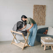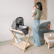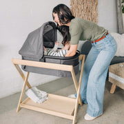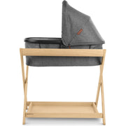 Take your Bassinet from boulevard to bedroom by simply snapping it into the secure, elevated Bassinet Stand to create a safe sleep space for baby. Constructed of durable, FSC Certified wood with a convenient storage tray at bottom, the compact stand features an open-and close-design and folds easily for storage.